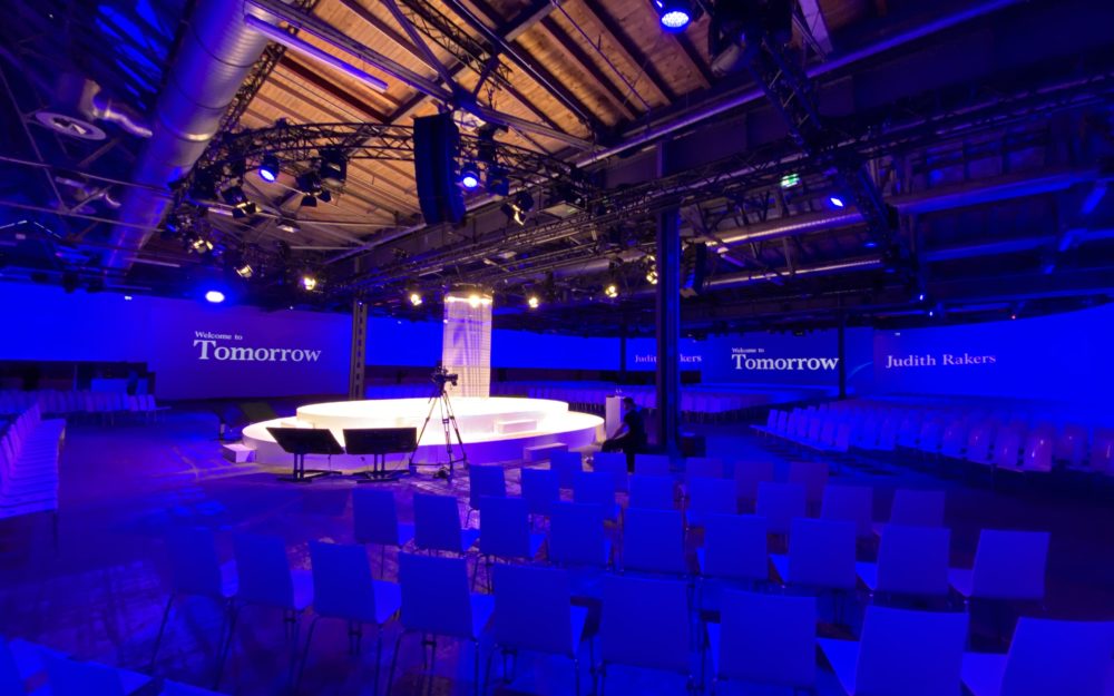 Blau beleuchtetes Business Event mit hell angestrahlter Bühne
