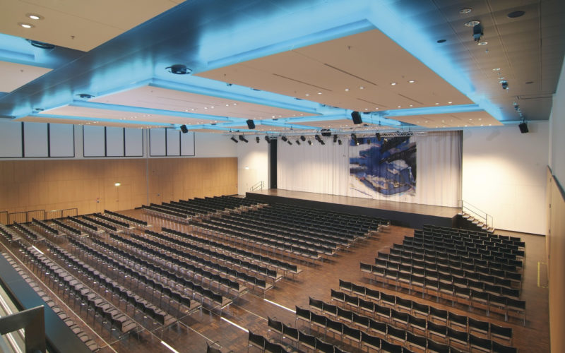 Großer Konferenzsaal mit vielen schwarzen Stühlen und blauer Beleuchtung, Eventlocations für bis zu 1000 Personen in Köln