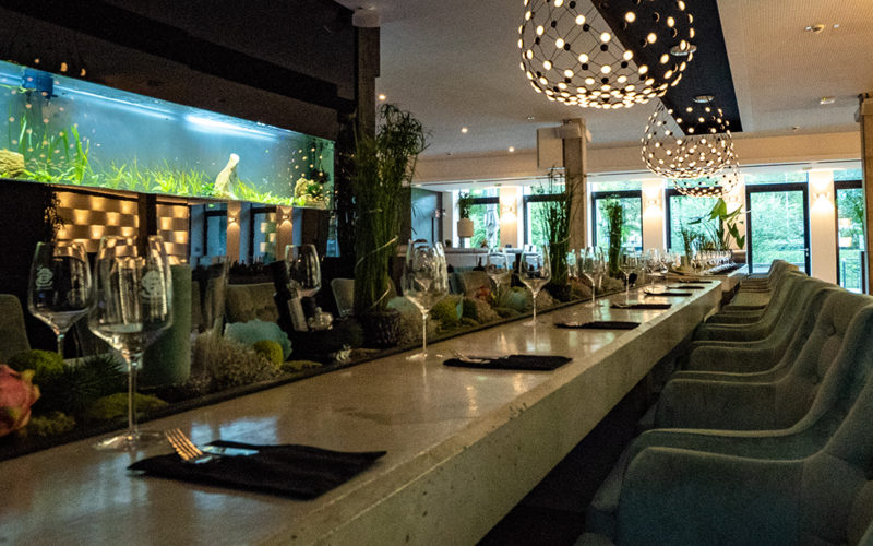 Erstklassige Location mit einem langen Tisch, Sesseln und Aquarium, Firmenfeier in Hannover