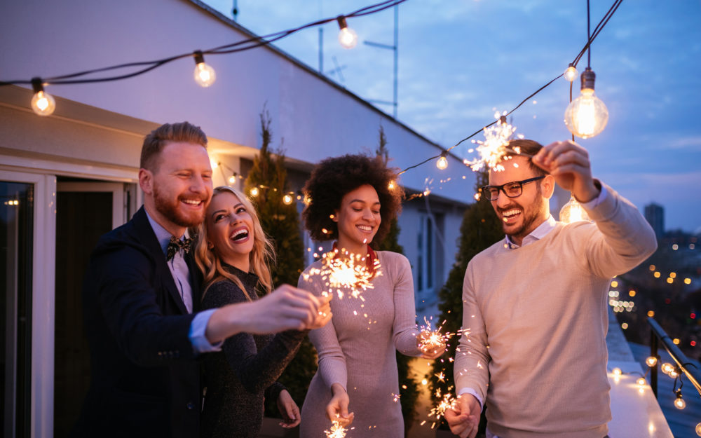 Auf einer Party stoßen mehrere Leute zusammen an, während goldenes Konfetti durch die Luft fliegt, man sieht jedoch nur die jeweiligen Arme und Gläser