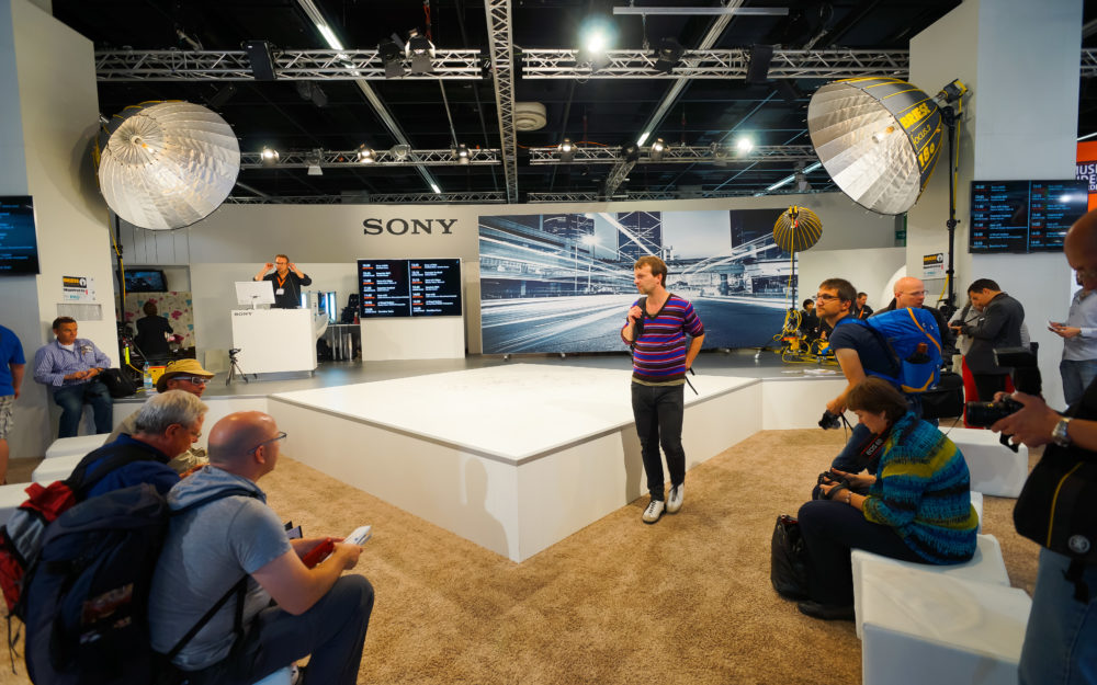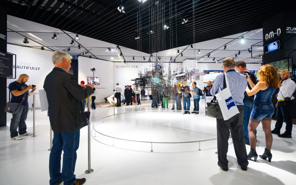 Eine Produktpräsentation während einer Messe mit weißer Dekoration und verschiedenen Besuchern