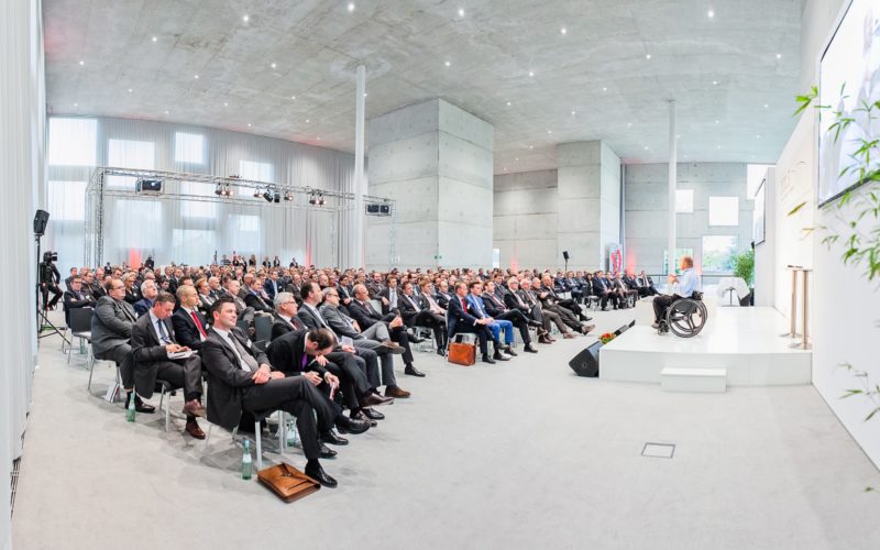Eine zahlreiche Menge an Leuten sitzen in einem modernen geräumigen Gebäude und hören bei einer Produktpräsentation zu