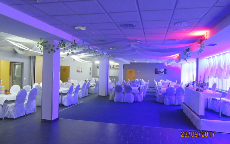 Partyraum für eine Firmenfeier in Schwerin, mit Club Beleuchtung und weiß gedeckten Tischen, Tanzfläche