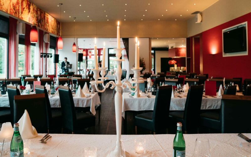 Raum mit vielen Tischen, Stühlen und einer roten Wand; Firmenfeier in Tübingen