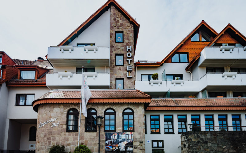 Hochzeitslocation in Detmold. Zwei altmodische Spitzdachhäuser mit braunem Dach