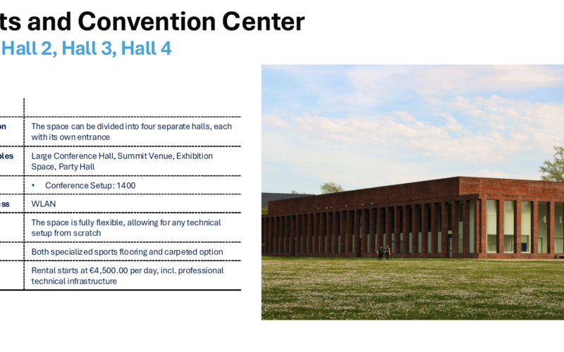 Schon das großzügige Foyer mit der eindrucksvollen Glasarchitektur bietet ein herausragendes Flair für Ihr Event. 430 Quadratmeter lichtdurchfluteter Raum erlauben je nach Bestuhlungsart bis zu 300 Gäste. Der East Wing bereitet auf 320 Quadratmetern die Basis für 330 Teilnehmer, während die edle Conference Hall eine vergleichbare Größe darbietet, um Tagungen, Konferenzen und Vorträge neben Produktpräsentationen zu verwirklichen. Der kleinere Conference Room bietet mit 137 Quadratmetern Platz für bis zu 80 Gäste. Das Convention Center bietet flexibel Platz für bis zu 1400 Personen und verfügt über Hängepunkte und Starkstrom.
