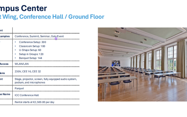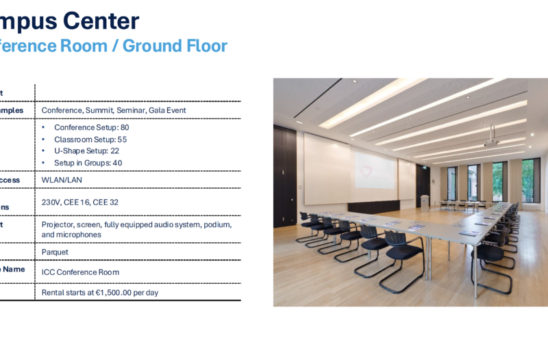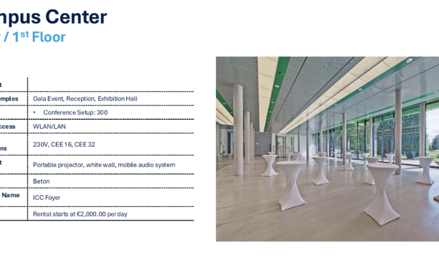 Auf dem Campus können Sie internationale Veranstaltungen perfekt umsetzen. Die Universität als Treffpunkt der Kulturen und als stimmungsvoller Akzent der Wissenschafts- und Geschäftswelt wird für Sie zum idealen Eventort, an dem die Campus-Atmosphäre für all Ihre Gäste erlebbar ist. Zum weitläufigen Ambiente stößt die moderne Flexibilität des Raumensembles, das für die Buchung als Eventlocation zur Verfügung steht. Incentives, Tagungen, Meetings und Seminare setzen Sie stilvoll, modern und einladend in den vier verfügbaren Eventräumen auf dem Campusgelände um.