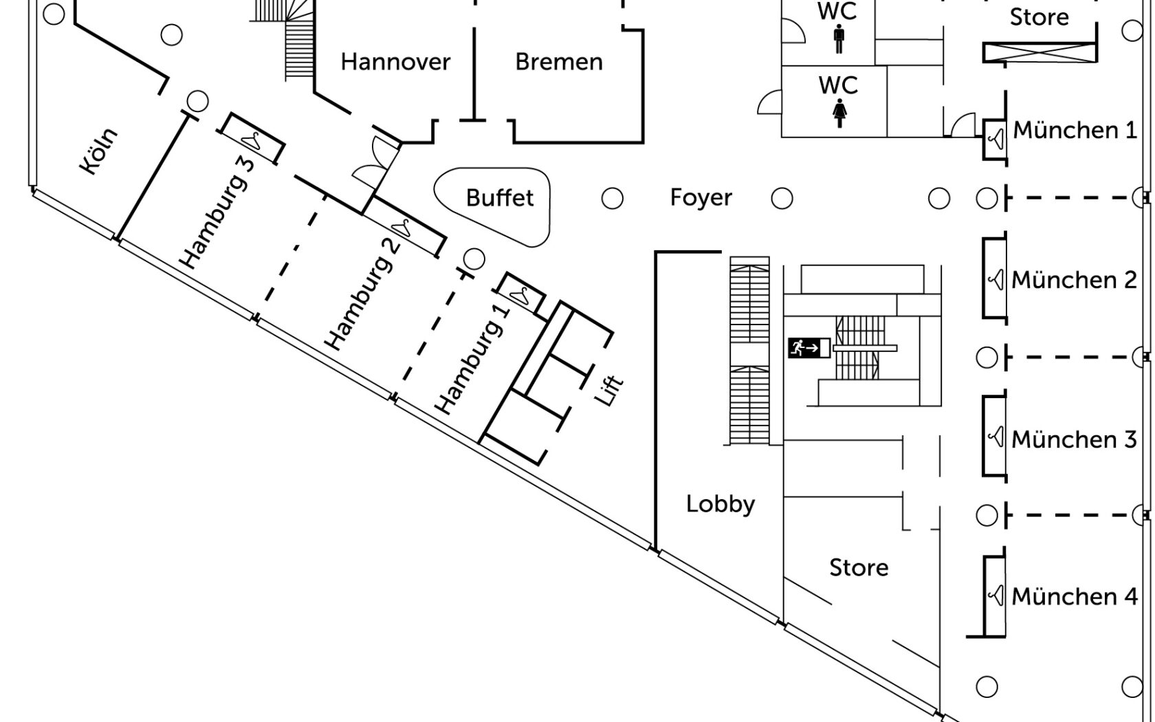 Alle Tagungsräume sind mit kostenfreiem WLAN, Klimaanlage, integrierter Beschallungsanlage, bodentiefen Fenster für optimale Lichtverhältnisse sowie Verdunkelungsmöglichkeiten ausgestattet. Zudem ist es möglich in allen Tagungsräumen die Fenstern zu öffnen, sodass Sie während oder in den Pausen lüften können. Hier können Sie in angenehmer Atmosphäre arbeiten.