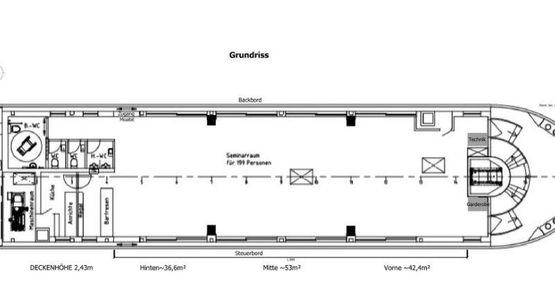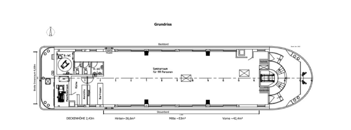Mitten in Moabit unweit vom Schloss Bellevue und dem Kurfürstendamm befindet sich, am ehemaligen Landeturm der Schüttschen Dampfmühle die Anlegestelle des Schiffes. Das Schiff kann sowohl still liegend gemietet, als auch für individuelle Fahrten gechartert werden. Das Schiff ist mit modernster technischer Ausstattung ausgerüstet. Je nach Wunsch kann das Schiff mit mobilen Trennwänden individuell aufgeteilt und auf die Gruppengröße angepasst werden. Für eine Pause zwischendrin bietet Ihnen das Schiff eine großzügige, 200 qm große, Dachterrasse auf de, Oberdeck, welche bei Veranstaltungen im Winter auch beheizt werden kann.