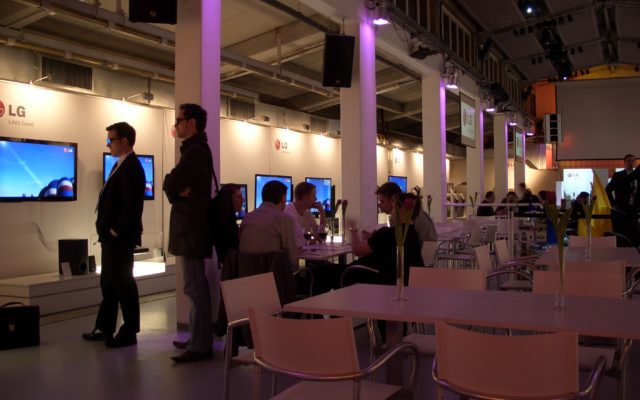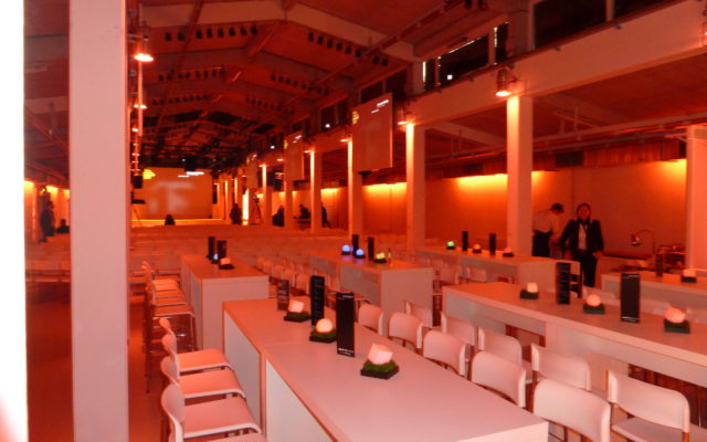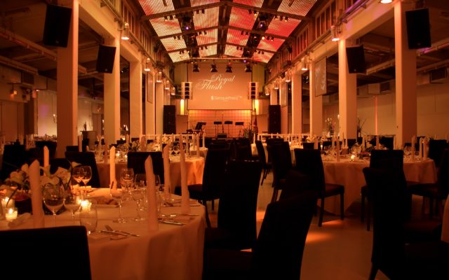 Das Erdgeschoss befindet sich im Erdgeschoss des Edelfettwerks. Die Gestaltung der Erdgeschosszimmer ist hell und einladend. Von reinweißen Zierwänden über perlmuttlackierte Böden bis hin zu Wänden in auffälligem Orange wurden mobile Theken und große zylindrische Leuchten installiert. Der gesamte Raum ist mit indirektem LED-Licht ausgestattet. Beide Seiten des Raumes sind mit großen Bildschirmen ausgestattet, die alle Arten von modernen Bildern wiedergeben können, perfekt für Branding und Foto- und Filmkritik. Große raumhohe Fenster im Erdgeschoss lassen viel Sonnenlicht herein und bieten Blick auf den üppigen Innenhof des Edelfetwerks. Öffnen Sie die Tür zur Terrasse, die sich auf jeder Seite des Raumes ca. 3 Meter befindet, und Sie betreten die 60 m² große Terrasse, die mit Bankirai-Bäumen bedeckt ist.