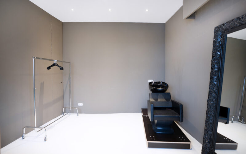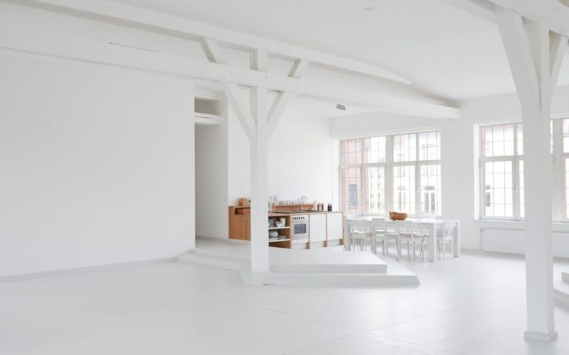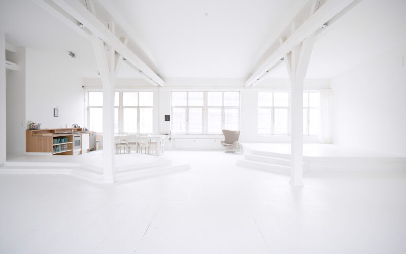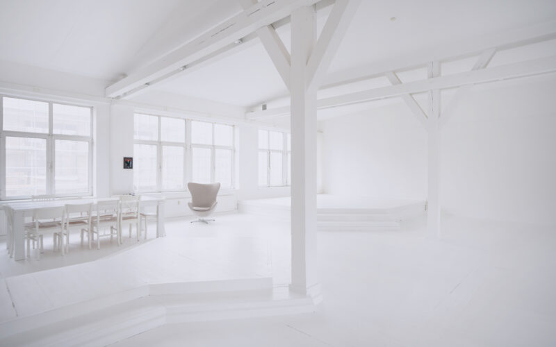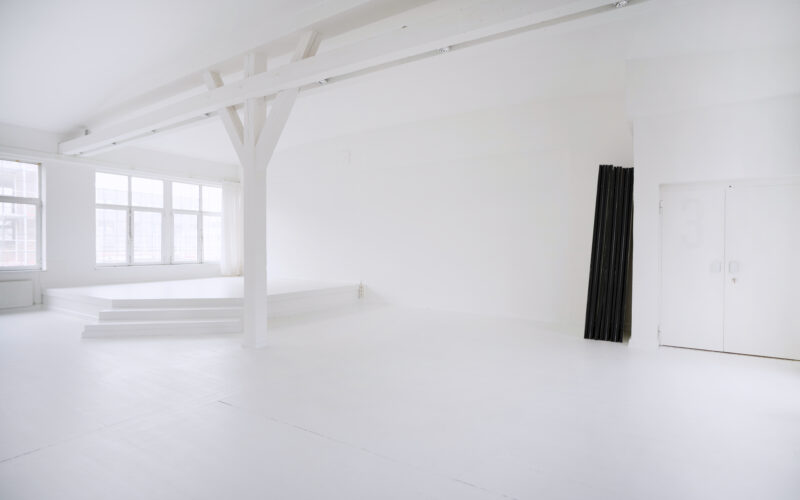 Das Studio verfügt über ein weißes Interieur mit weißen Holzdielen und Holzpodesten, die leicht zur Bühne und Laufsteg ungenutzt werden können.