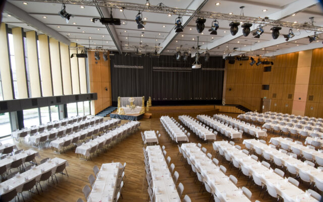 Auf einer Fläche von 50 bis 3.000 m² sind maßgeschneiderte Angebote für alle Größen von Events in vielfältigsten Betischungs- und Bestuhlungsvarianten möglich. Ganz gleich ob einerseits Theater, Comedy und Musical oder andererseits Kongresse, Firmenveranstaltungen, Messen und Tagungen: Die Kongresshalle Böblingen ist ein multifunktionales Raumwunder, das für jedes Event den passenden Rahmen bietet – sei es klassisch als Präsenzveranstaltung oder digital als rein virtuelles oder hybrides Format.