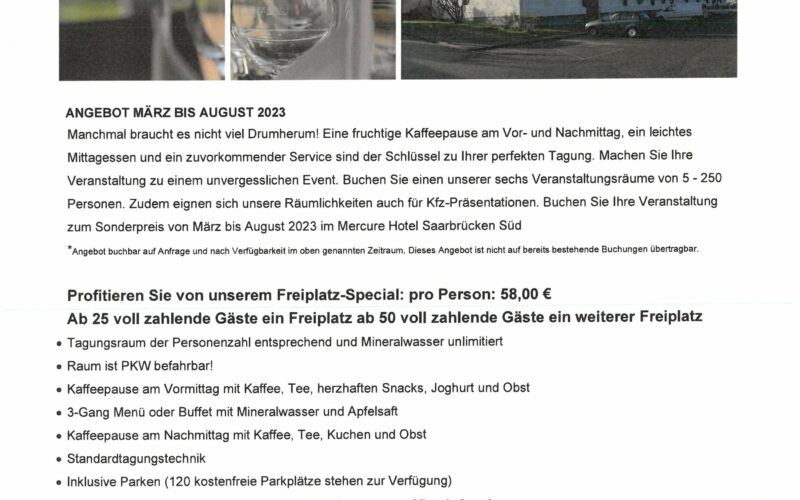 Das 2018 renovierte Mercure Hotel Saarbrücken Süd erwartet Sie mit freundlichem Service, modernen Hotelzimmern und einem erstklassigen Restaurant. Genießen Sie saarländische Spezialitäten und französische Köstlichkeiten im eleganten Hotelrestaurant "L'Orangerie", begleitet von einem unserer herrlichen Weine "Grand Vins Mercure". Unsere erlesene Weinauswahl können Sie auch abends an der Hotelbar "La Source" genießen. Das Highlight unseres Hotels ist die große Terrasse und das Freibad mit großer Liegewiese und Garten. Bei Interesse verfügt das Hotel über mehrere Tagungs- und Veranstaltungsräume die für Ihre Events angefragt werden können.