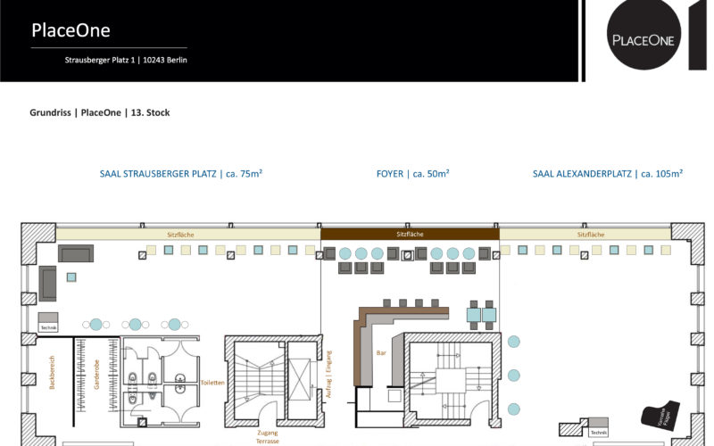 Im PlaceOne können Sie einen 360° Ausblick genießen wie Sie keinen zweiten in Berlin finden werden. Unweit vom Berliner Fernsehturm liegt das PlaceOne im historischen Zentrum der Hauptstadt und bietet einen fantastischen Kontrast zwischen modernem Interior und historischer Umgebung. Das PlaceOne bietet ausreichend Platz für 190 Personen und eignet sich für Events verschiedenster Anlässe. Von Firmenevent über Jungesellinenparty hier finden Sie die richtige Location. Ein weiteres Highlight der Location ist außerdem die Dachterrasse mit 100 qm und die individuell bespielbaren Multimediaflächen hinter der Bar.