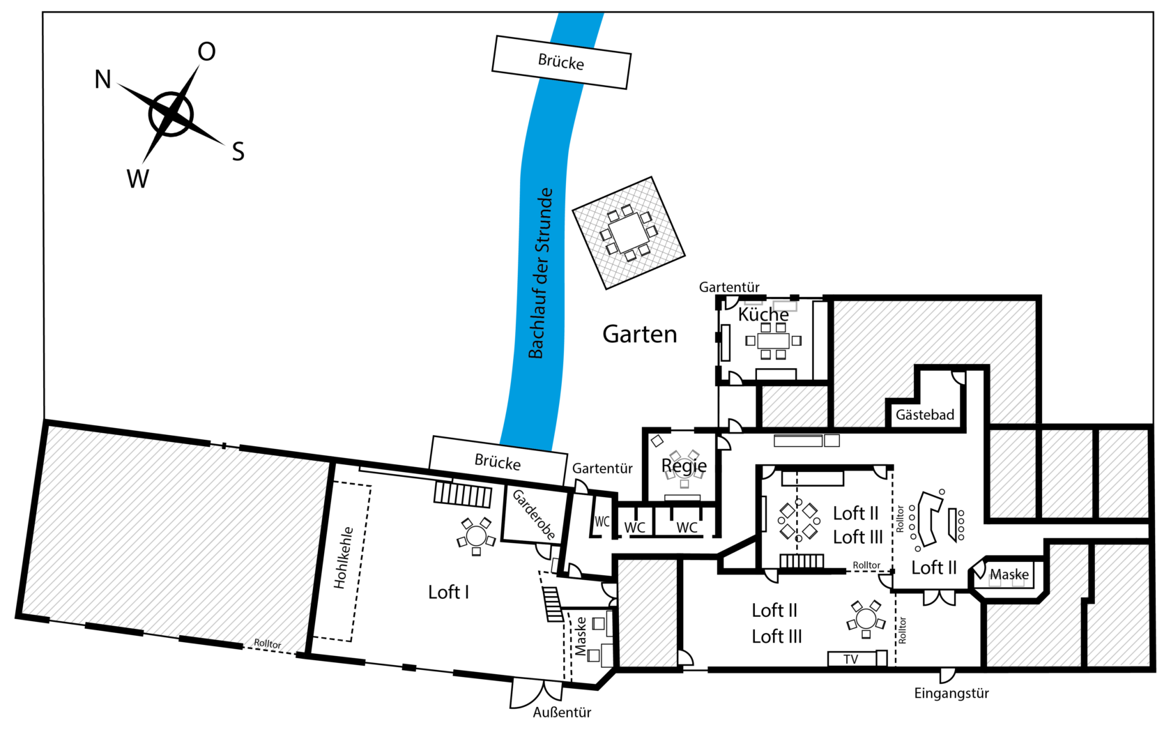 Der ehemalige Industrieraum mit über 100-jähriger Geschichte, bietet auf 900 m2 große Fensterfronten, ermöglicht verschiedene Raumkombinationen und wird in erster Linie als Foto- und Mietstudio genutzt. Die ganze Location hat einen besonderen Charme der auf unterschiedlichste Weise eine wirklich außergewöhnliche Atmosphäre für Seminare, Schulungen, Veranstaltungen bietet. Darüber hinaus kann ein 2.000 Quadratmeter großer parkähnlicher Garten genutzt werden, durch den ein Bach fließt.
