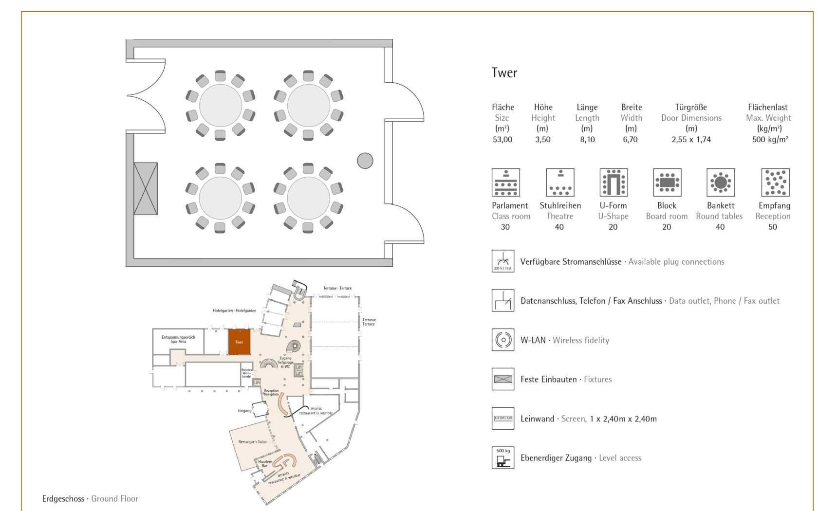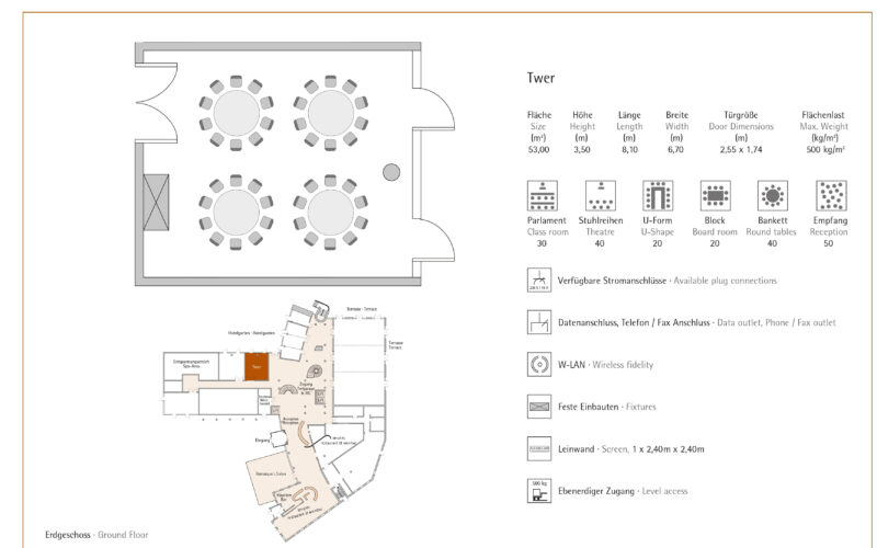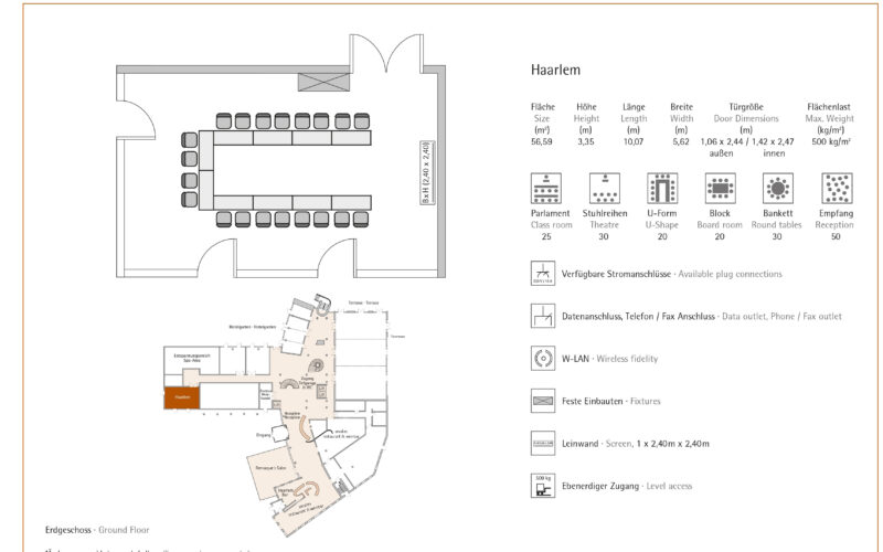Dank ihrer mobilen Wände sind die Veranstaltungsräume trennbar – auf Wunsch kann auch das Foyer mit einbezogen werden. Sie suchen eine Location für eine Ausstellung? Dann sind Sie hier genauso richtig wie bei der Planung von Workshops und Feiern.