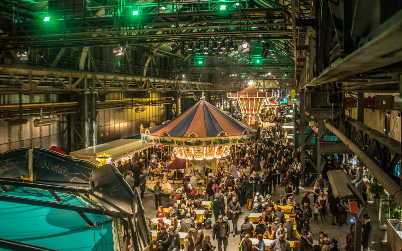 Große belebte Halle mit Karussellen und bunten Ständen in grünen und goldenen Licht; Messehalle in Bochum