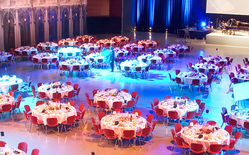 Runde Tische gedeckt für ein Dinner vor einer Bühne; Messehalle in Bochum