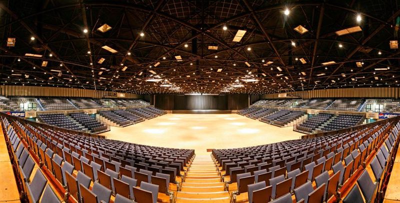 Leere Fläche mit Stuhlreihen ringsherum; Messehalle in Düsseldorf