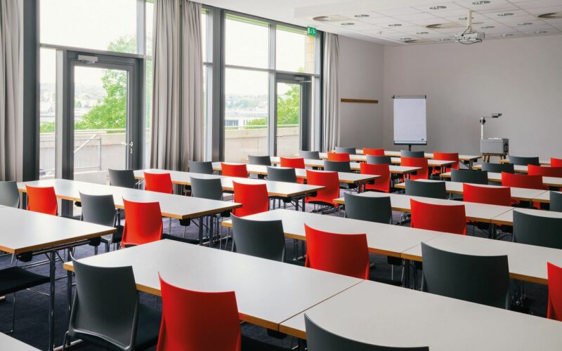 Großer Raum mit Tischen und rot-schwarzen Stühlen; Messehalle in Wuppertal