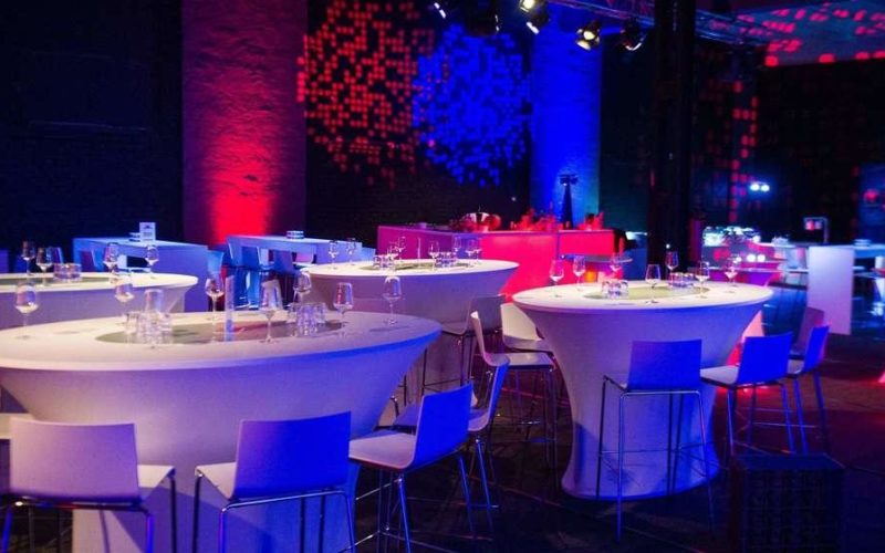 Gemütliche Eventlocation mit vielen kleinen Tischen und Stühlen und gedämmten Licht; Party in Mannheim