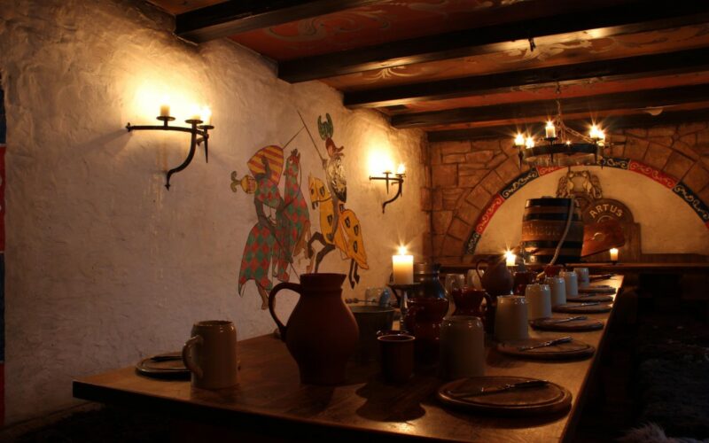 Mittelalterlicher Raum mit gedämpften Licht, Tischen und Stühlen; Schlösser und Burgen in Hannover