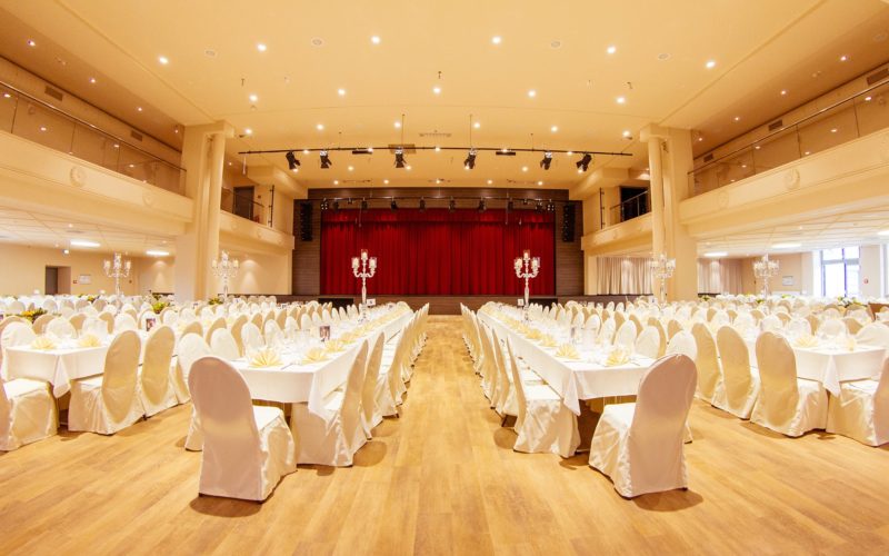 Schöner großer Saal mit einer Bühne sowie vielen Tischen und Stühlen; Silvesterparty in Leipzig