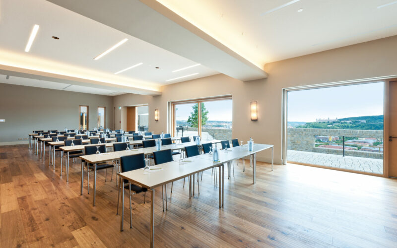 Lichtdurchfluteter Raum mit großen Fenstern, Tischen und Stühlen; Tagungsraum und Konferenzraum in Würzburg